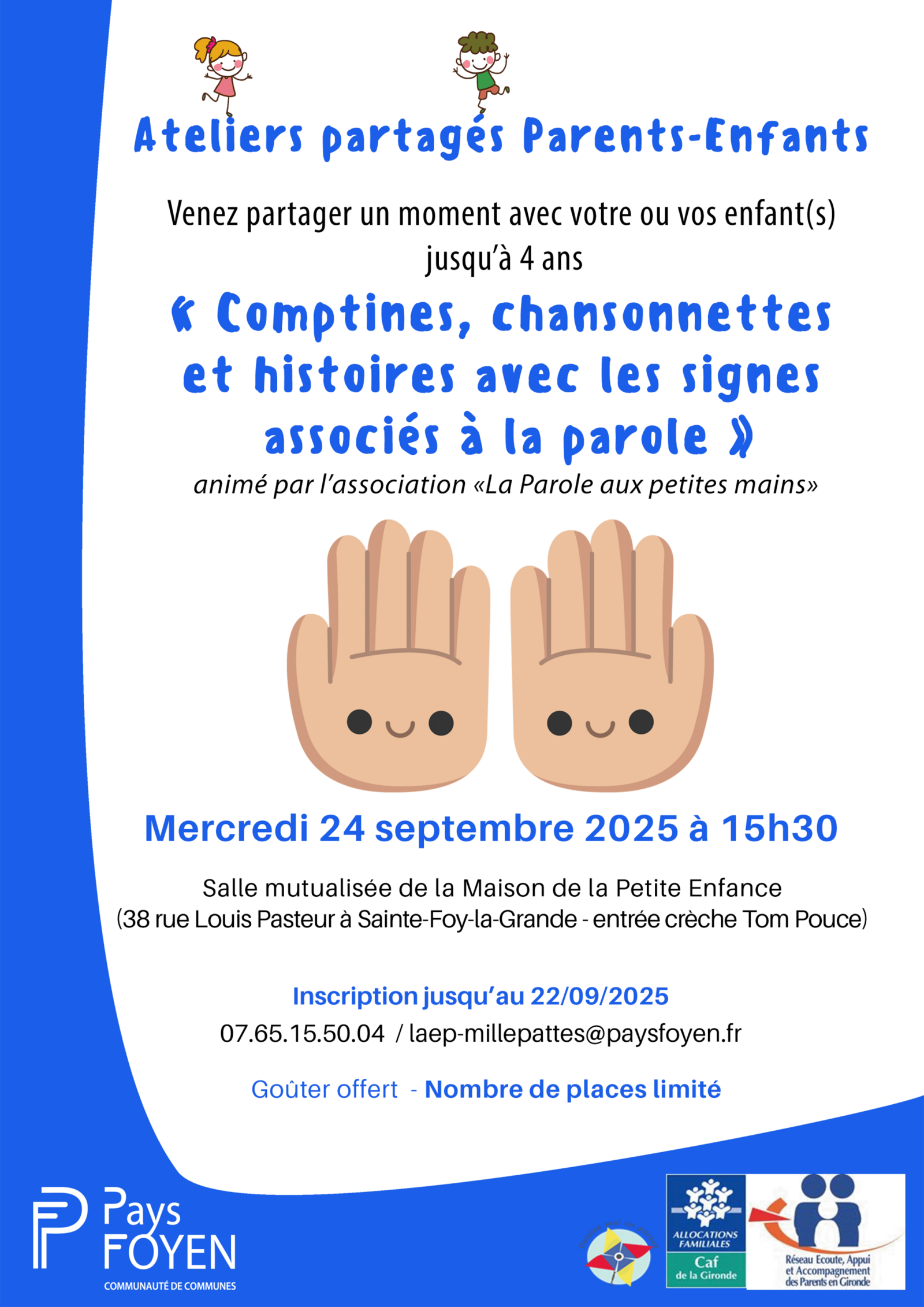 Mercredi 24 septembre 2025 à 15h30 Salle mutualisée de la Maison de la petite Enfance 38 rue Louis Pasteur à Sainte-Foy-la-Grande (entrée crèche Tom Pouce)