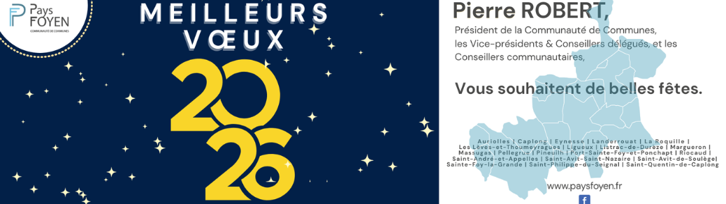 Pierre ROBERT, Président de la Communauté de Communes du Pays Foyen, les Vice-présidents & Conseillers délégués, et les Conseillers communautaires, vous souhaitent une très belle année 2026. Ils vous adressent leurs meilleurs vœux de santé, de bonheur et de réussite.